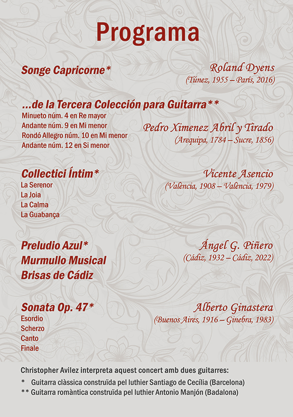 In this recital, he will perform a remarkable repertoire using two different guitars: a classical concert guitar and a romantic guitar. His performance will include works from various periods and composers with distinct styles: Pedro Ximénez Abril y Tirado, Vicente Asencio, Alberto Ginastera, Ángel G. Piñero, and Roland Dyens.